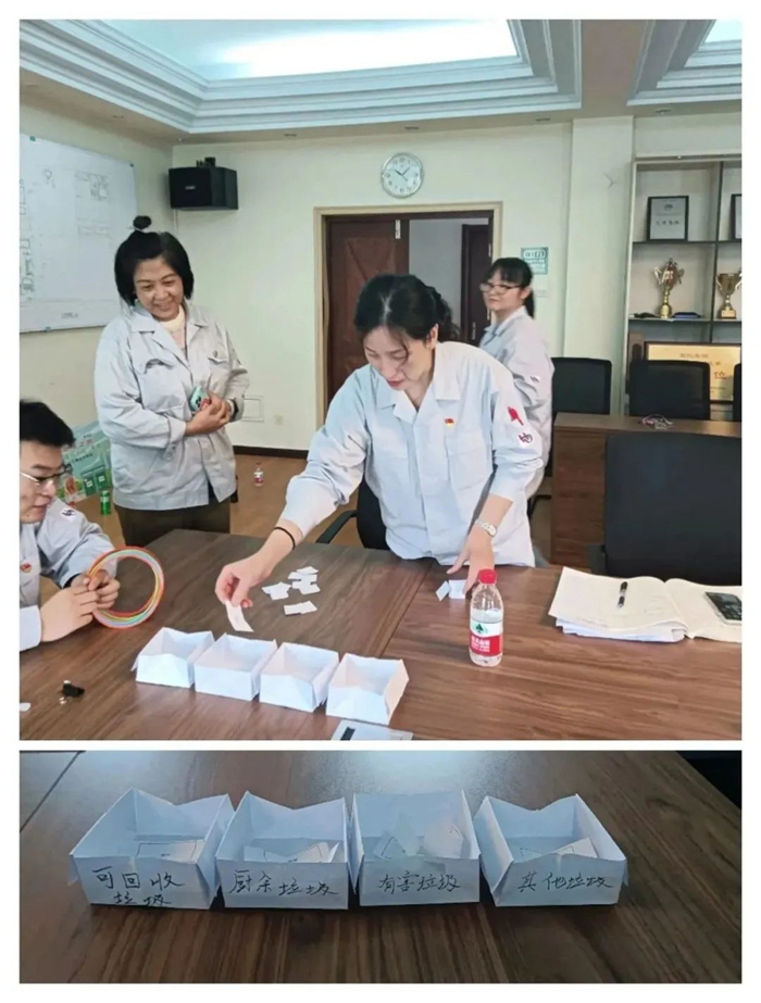 為將垃圾分類“持久戰(zhàn)”變?yōu)?ldquo;新風(fēng)尚”,基層黨支部精心組織,開展了以“垃圾分類”為主題的形式多樣的黨建活動(dòng)。第一黨支部利用小道具,以互動(dòng)的方式模擬垃圾分類和分投情景,或者將垃圾分類知識(shí)宣傳、普及與套圈小游戲相結(jié)合,達(dá)到了寓教于樂、融學(xué)于趣、化教于心的目的和效果。活動(dòng)的開展,生動(dòng)有效地幫助干部職工鞏固垃圾分類知識(shí),提升了垃圾投放的正確率。