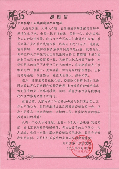近日,北化集團辦公室接到一封來自豐臺區(qū)右安門街道開陽里第三社區(qū)黨委寄來的感謝信,對集團信息化部干部孔維無償向社區(qū)捐贈防疫物資表示衷心感謝。