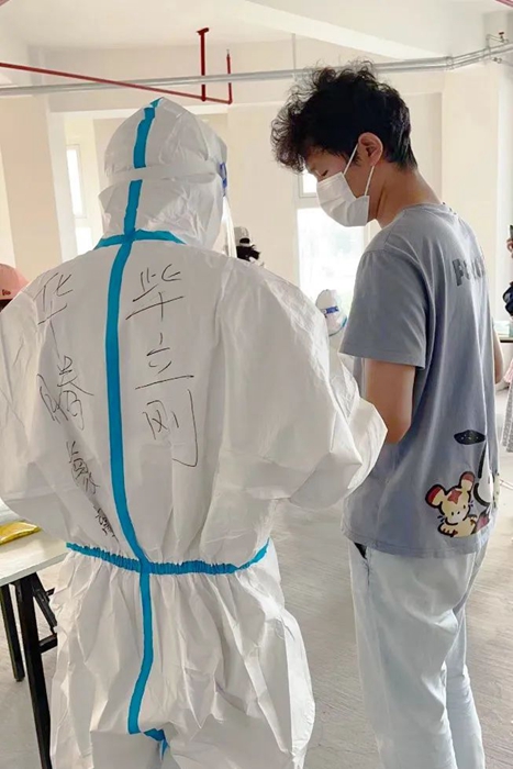 最讓我難以忘記的是穿大白的經歷。因這一穿就是三個多小時,以前都是看別人穿防護服,現在輪到我了。防護服密不透風,穿著三個多小時后脫下來時,全身都已經濕透了,這時深刻體會到了醫護人員和志愿者的辛苦和不易。