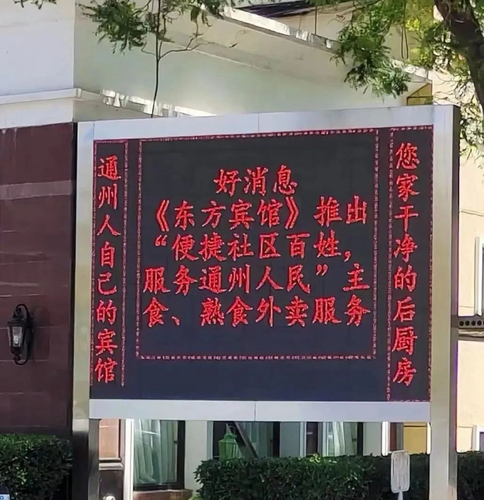 “通州人自己的賓館,您家干凈的后廚房”——北京東方賓館外碩大的電子顯示屏上的紅字甚是引人注目。