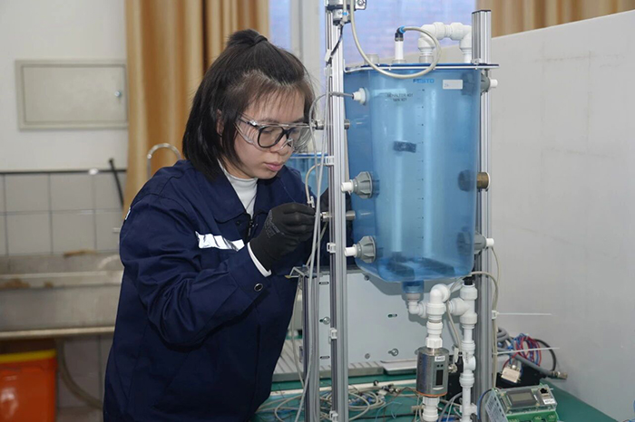 一滴水的旅程,關乎萬家冷暖,關乎一方水土。當千家萬戶為春節團圓而舉杯時,一群年輕人正在為守護那泓清泉背后的安全與生機而努力練習著。水處理技術項目實驗室里,來自河南、山西等地職院的11名年輕選手,正凝神搭建著微縮的“城市水脈”。混凝、沉淀、過濾、消毒……一座現代化水廠的完整流程,在不足兩平方米的操作臺上正精密“上演”。選手趙可俯身調整管路,動作沉穩而利落。教練目光如尺,在她身后半步距離之內,衡量著她每一次操作的精度。在新任世賽水處理技術項目中國專家組組長柯瑞華和教練團的帶領下,趙可和參加實訓的10名伙伴,正在努力融會貫通化學、生物、機械、自動化等多學科知識,目標直指現代化污水處理廠的“總工程師”。春節前集訓的日夜里,他們將反復演練從水質分析到系統檢修的全套模塊。